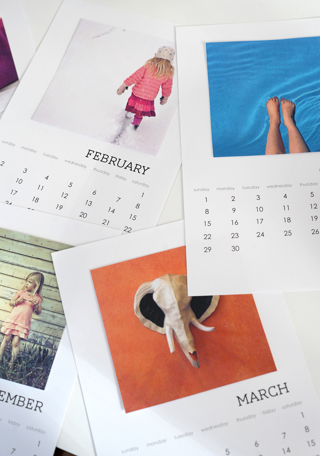 All you need for this project are six pages of white card stock to print the calendar on, a ruler, pair of scissors and some photo prints or artwork.