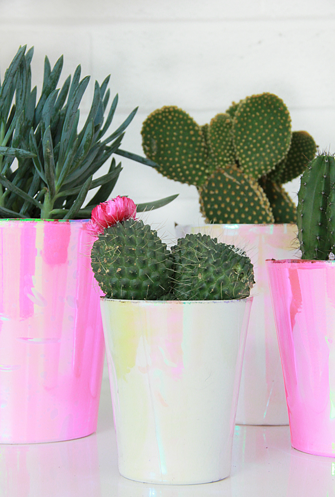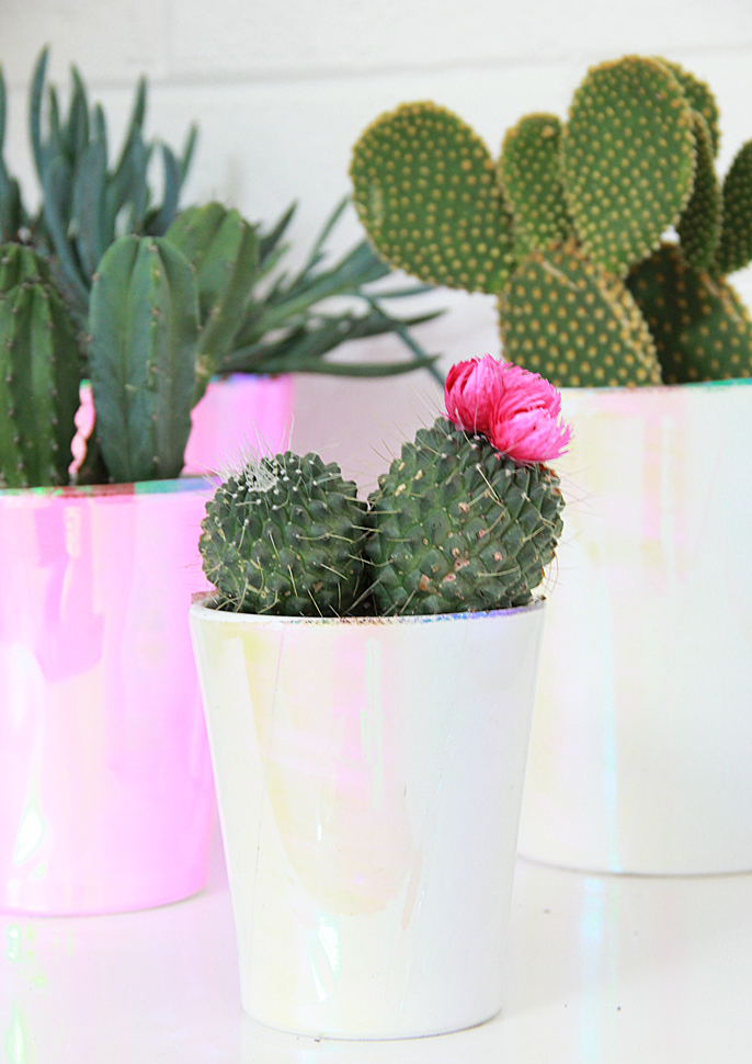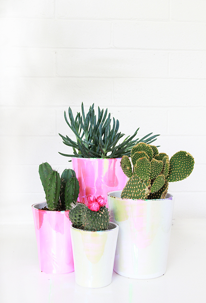 You want white plant pots since the vinyl film is see through, so any color underneath will show up. I picked up mine at the thrift store, you could also spray paint any pot you have white.